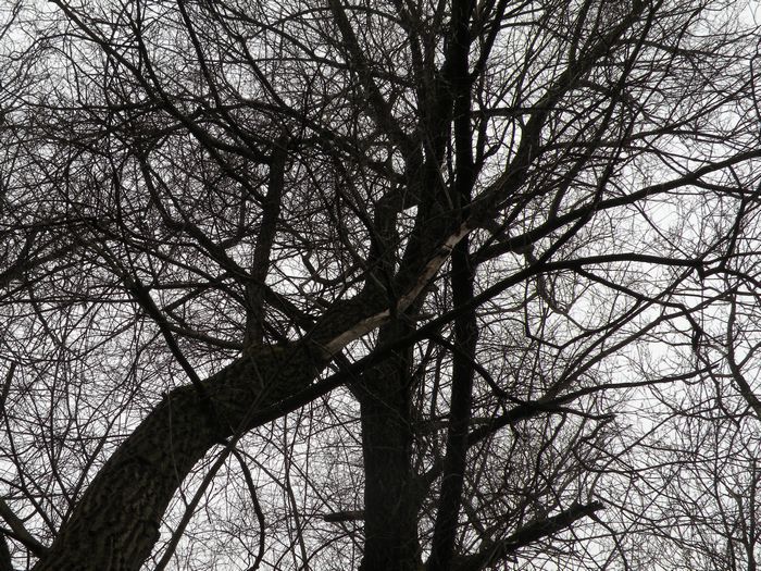 Der Blick in die Krone(n) zeigt links den durchgenagden Baum, der sich seinem rechten Nachbarn in die Arme geworfen hat. Baum tot, Biber beleidigt - keinem ist geholfen.