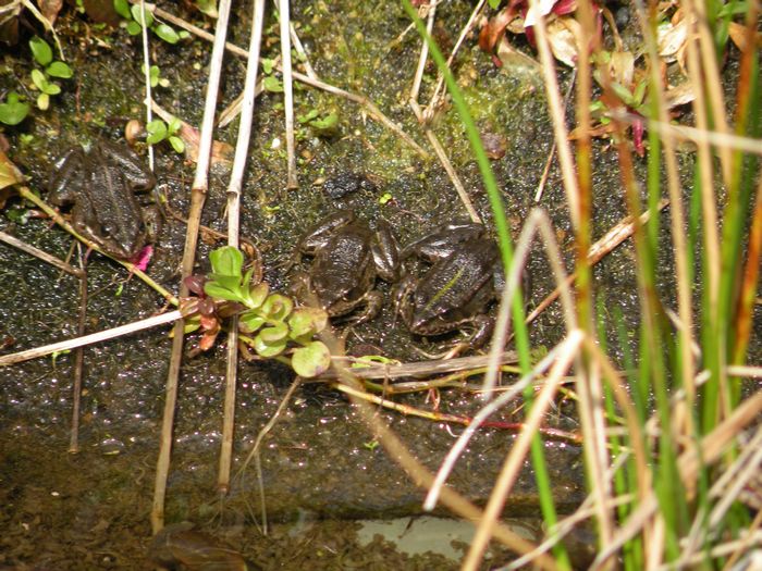 Als ich sie photographierte, sah ich nur zwei Frösche, erst jetzt, als ich unter den ca. 10 Bildern das beste auswählte, sah ich, daß sogar 3 von den Jungs auf einem Fleck saßen.
