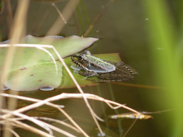 Warum im Wasser herumhängen, wenn man doch so bequeme Seerosen-Wasserliegen hat. Herr Frosch kommt inzwischen täglich. (16.06.2013)