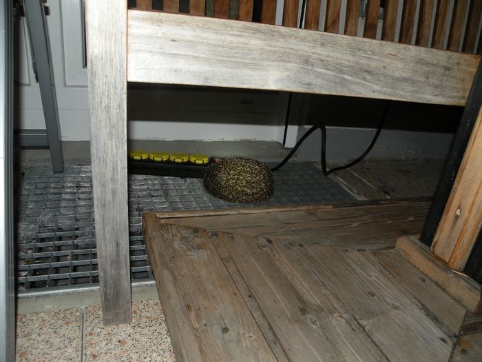 Wir hatten uns schon ein paar Mal gewundert, daß wir so viel Igel- ähm - Haufen unter dem Gartentisch fanden. Heute sah ich einen Igel dort auf dem Kellerrost liegen, auch zwei Stunden später lag er noch dort. Irgendwann dachte ich, morgen werde ich einen toten Igel wegräumen müssen. Aber gegen 22 Uhr stand er auf, kratzte sich ein bißchen und trollte sich dann.