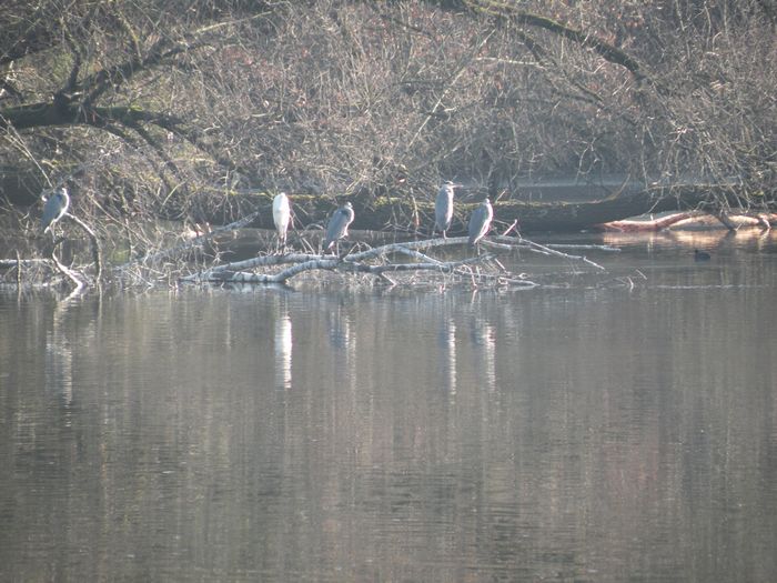 ... 5 Reiher, davon ein Silberreiher, beim Stelldichein. Neulich sah ich bereits einmal 4 von Ihnen in der Luft über dem See, heute hatten sie sich wohl zur Siesta versammelt.