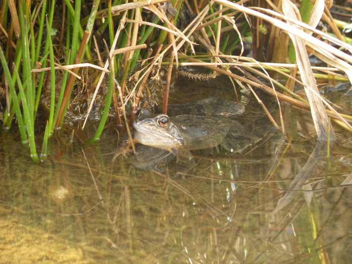 Während einer Pause, die ich nach dem anstrengendem Vertikutieren machte, hörte ich einen Frosch quaken. Nach längerem Suchen fand ich ihn. Hier hat er schon wieder einen dicken Hals, aus dem gleich ein "Quaaak" entfleucht.