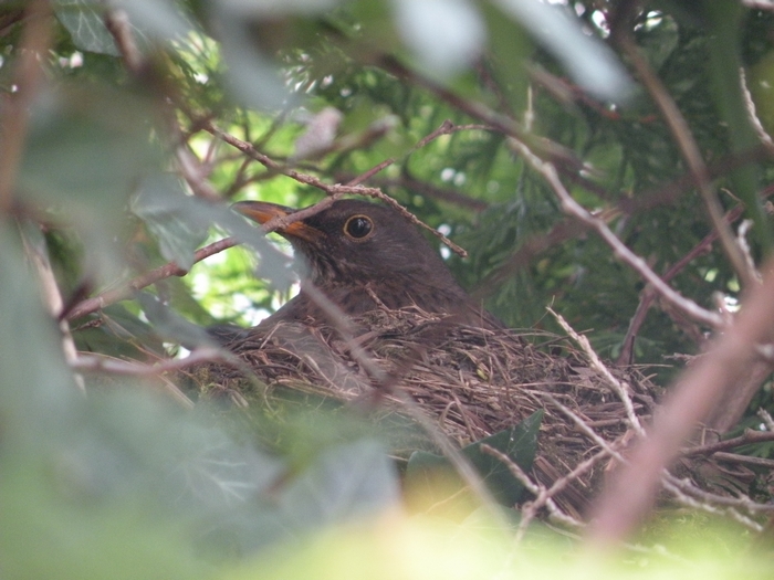 In einer Tuja auf der Grundstücksgrenze zum Nachbargarten brütet eine Amsel. Die Jungen sind wohl schon geschlüpft, denn ich habe beide Eltern schon füttern sehen. Ab und an brauchen sie wohl aber noch mal eine warme Packung, das erledigt die Amselfrau offensichtlich gerade.