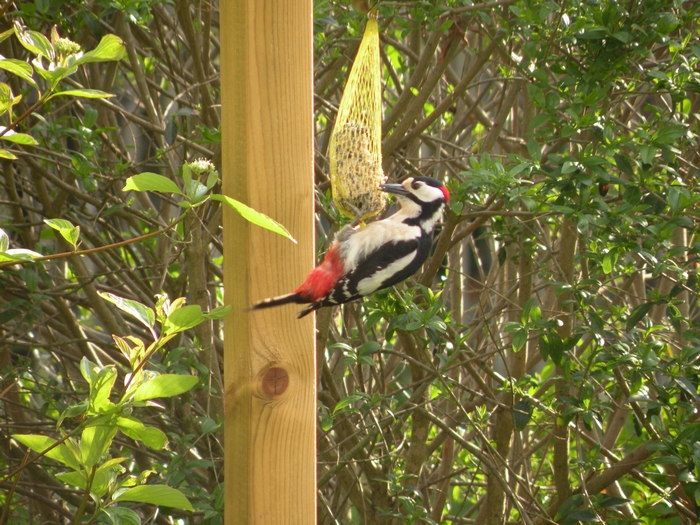 Solange da noch ein Knödel hängt, hängt auch der Buntspecht an ihm. Einfacher findet er wohl keine Nahrung. (01.05.2014)