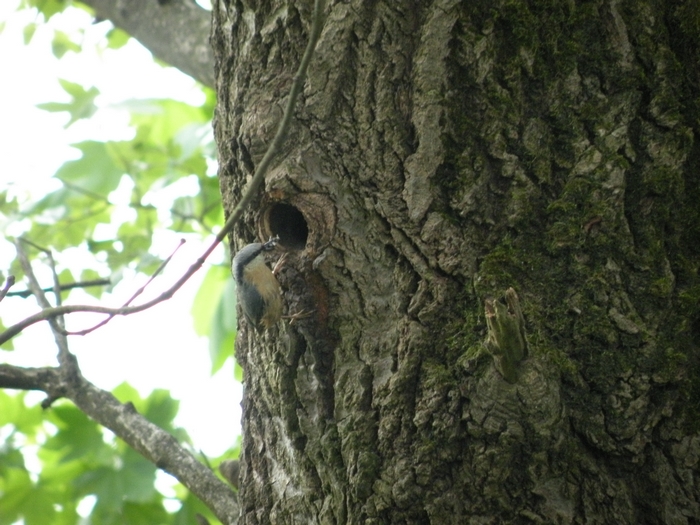 Dieser Kleiber flog, mit dem Schnabel voller Futter, an mir vorbei und anschließend auf den Ast eines nahen Baumes. Schön, dachte ich, schaun wir doch mal, wo der seine Bruthöhle hat. Schön, dachte der Kleiber, der da unten beobachtet mich, dann werde ich ganz sicher nicht zu meiner Bruthöhle fliegen.
