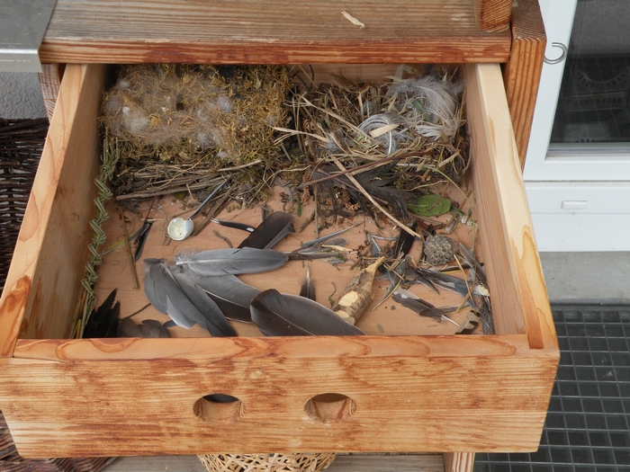 In meiner "Fundschublade" meines Pflanztisches hat sich im Vogelnest hinten links eine Hummel eingenistet. Die beiden Grifflöcher in der Front der Schhublade dienen ihr als Einflugloch.