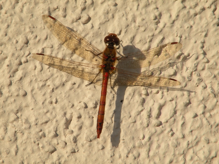 Neben zig Tagpfauenaugen schwirren in den letzten Tagen auch diverse Libellen durch die Luft und über den Teich. Diese genießt die letzten Sonnenstrahlen an der Hauswand.