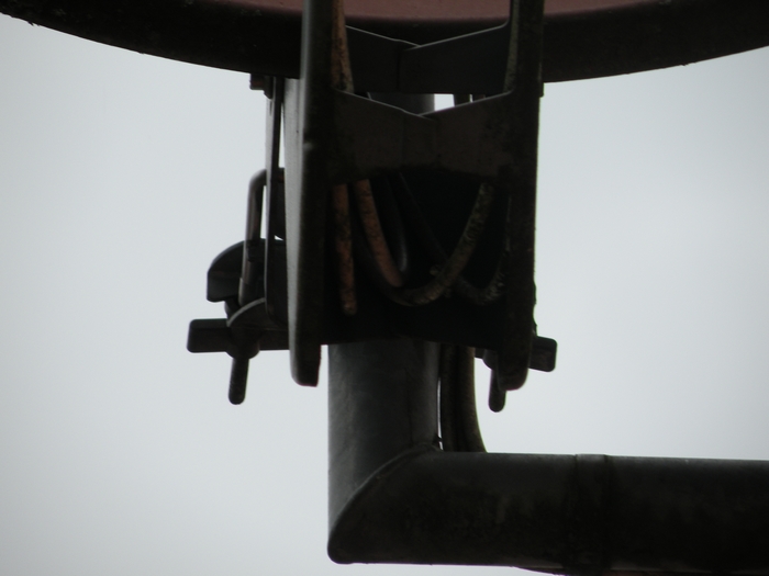 Dort, wo man die beiden, sich kreuzenden, hellen Kabel sieht, übernachtet seit einigen Tagen eine Meise. Man sieht nur einen kleinen, reglosen Federball, der aber gut geschützt ist. Das sie sich die Halterung unserer Satschüssel als Schlafplatz ausgewählt hat liegt vielleicht daran, dass sie aufgrund der Nähe zur SAT-Schüssel vor ihrem inneren Auge Fernsehen kann.