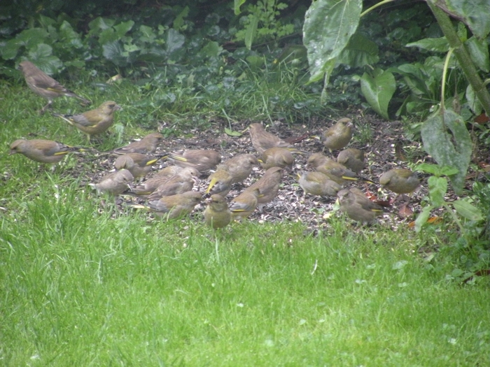 Die Population scheint sich nach der letztjährigen Virusepedemie gut erholt zu haben. Z.Zt. sind 25 - 30 Grünfinken gleichzeitig am Vogelhaus. (02.10.2014)