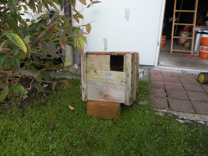 Ich stellte dann über ihn und sein Futter eine Kiste, da er doch arg ungeschützt auf der Wiese pennte. Als es dunkler wurde, hat er dann auch gefressen. Irgendwann war er dann weg, später am Tag sah ich ihn dann aber noch mal am Vogel-Futterplatz.