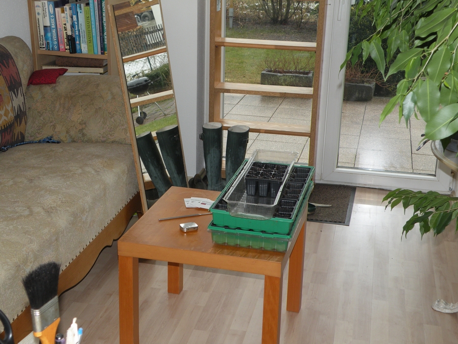 Heute morgen: Schneeregen, knapp 1°C. Dann muß ich die Tomaten halt drinnen säen. Teppich weg, kleines Tischchen hingestellt und los geht's. (28.02.2015)