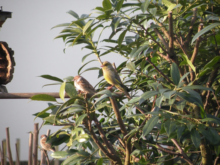 In trauter Zweisamkeit sitzen Feldsperling und Grünfink in der Morgensonne. (20.03.2015)