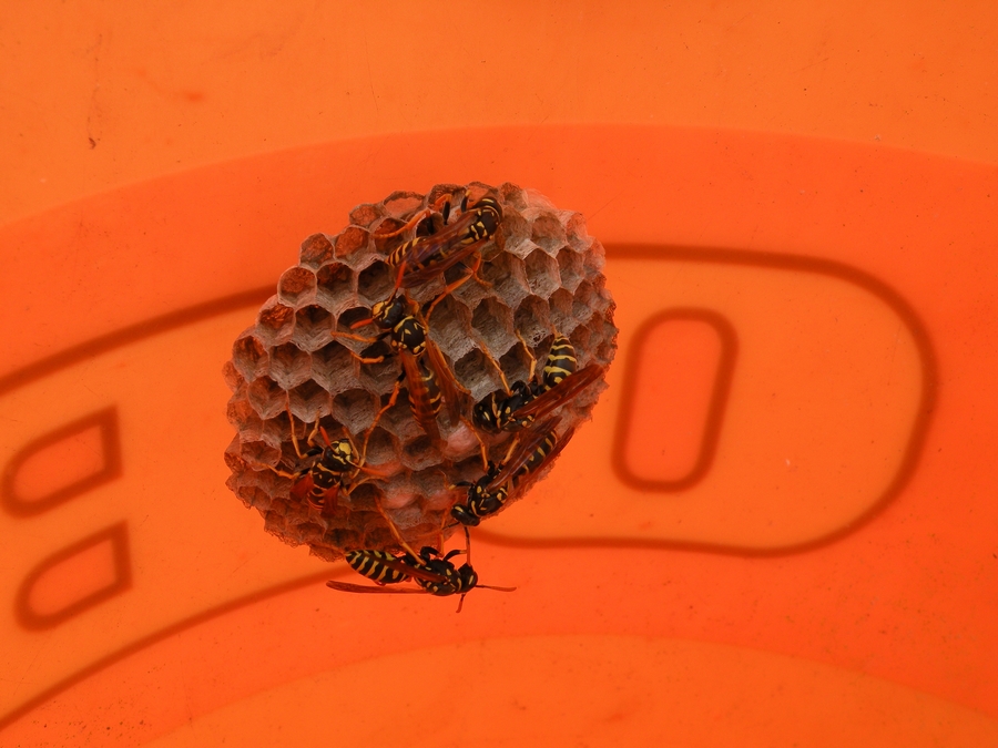 Der Obi-Eimer im Tomatenhaus muß es den Wespen angetan haben. Anders ist nicht zu erklären, warum sie jedes Jahr aufs neue ihr Nest dort bauen. (13.05.2015)