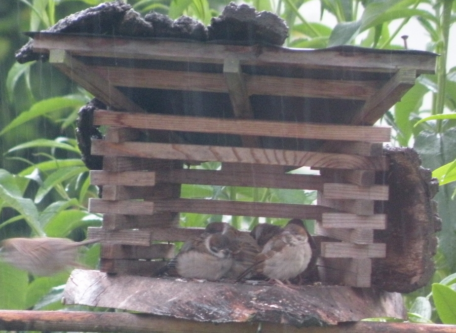 Bei strömendem Regen versammeln sich die Spatzenküken im wasserdichten Vogelhaus. (15.06.2015)