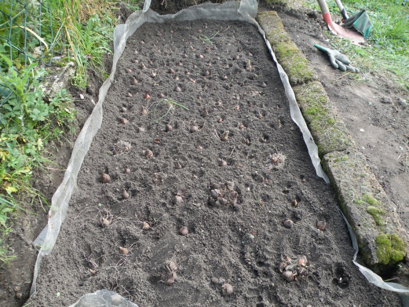 Nachdem ich das völlig verunkrautete Beet komplett ausgehoben und durch ein Erdsieb geworfen hatte, fanden die inzwischen rund 100 Zwiebeln wieder ihren Platz. (15.10.2015)