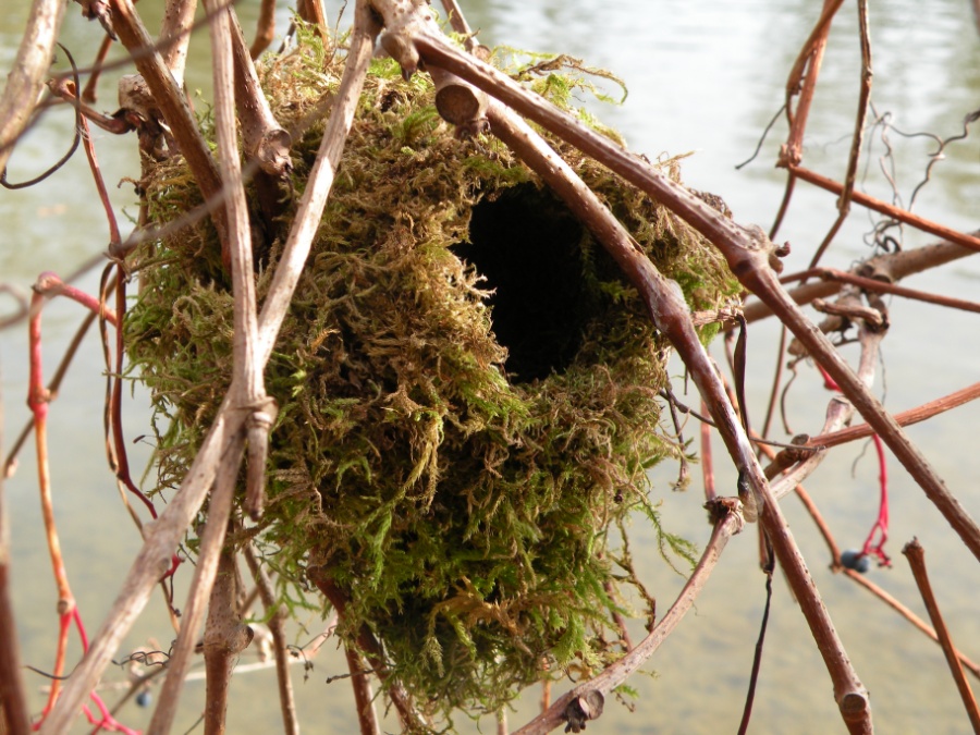 Höchstwahrscheinlich das Nest einer Schwanzmeise. Es hängt in einem Busch am Ufer eines Fischweihers. Da der Busch mit seinen Zweigen dem Wasser zugeneigt ist, schwebt das Nest ca. 1,5m über der Wasseroberfläche. (22.11.2015)