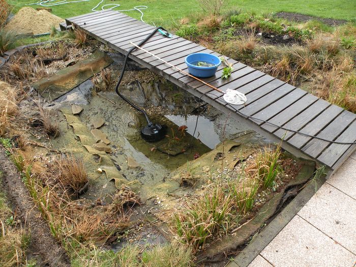 Eigentlich ist sie ja für andere Zwecke konzipiert, hier nun mußte die Teichpumpe den Teich leerpumpen bzw. erst einmal so weit leerpumpen, daß ich Fische, Frösche und anderes Getier einsammeln konnte.